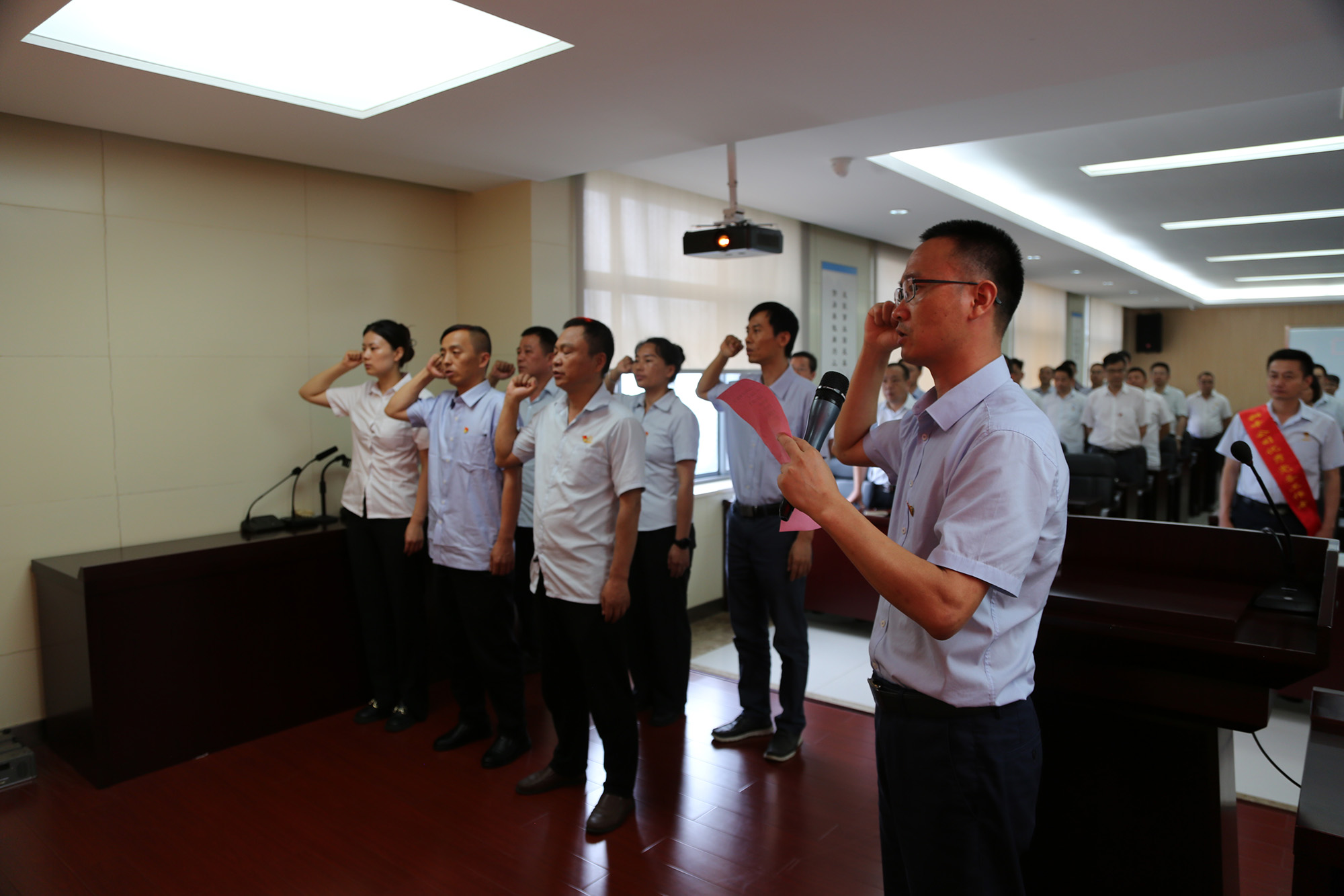 在首先進行的新黨員入黨宣誓儀式上,黨委委員林政宣布新黨員名單,歡迎新黨員加入黨組織并向他們提出希望和要求。隨后,由黨委委員何曉明領(lǐng)誓,新黨員進行入黨宣誓。在“兩優(yōu)一先”表彰環(huán)節(jié),公司黨委領(lǐng)導為受表彰對象頒發(fā)榮譽證書,“兩優(yōu)一先”代表分別作先進事跡報告。