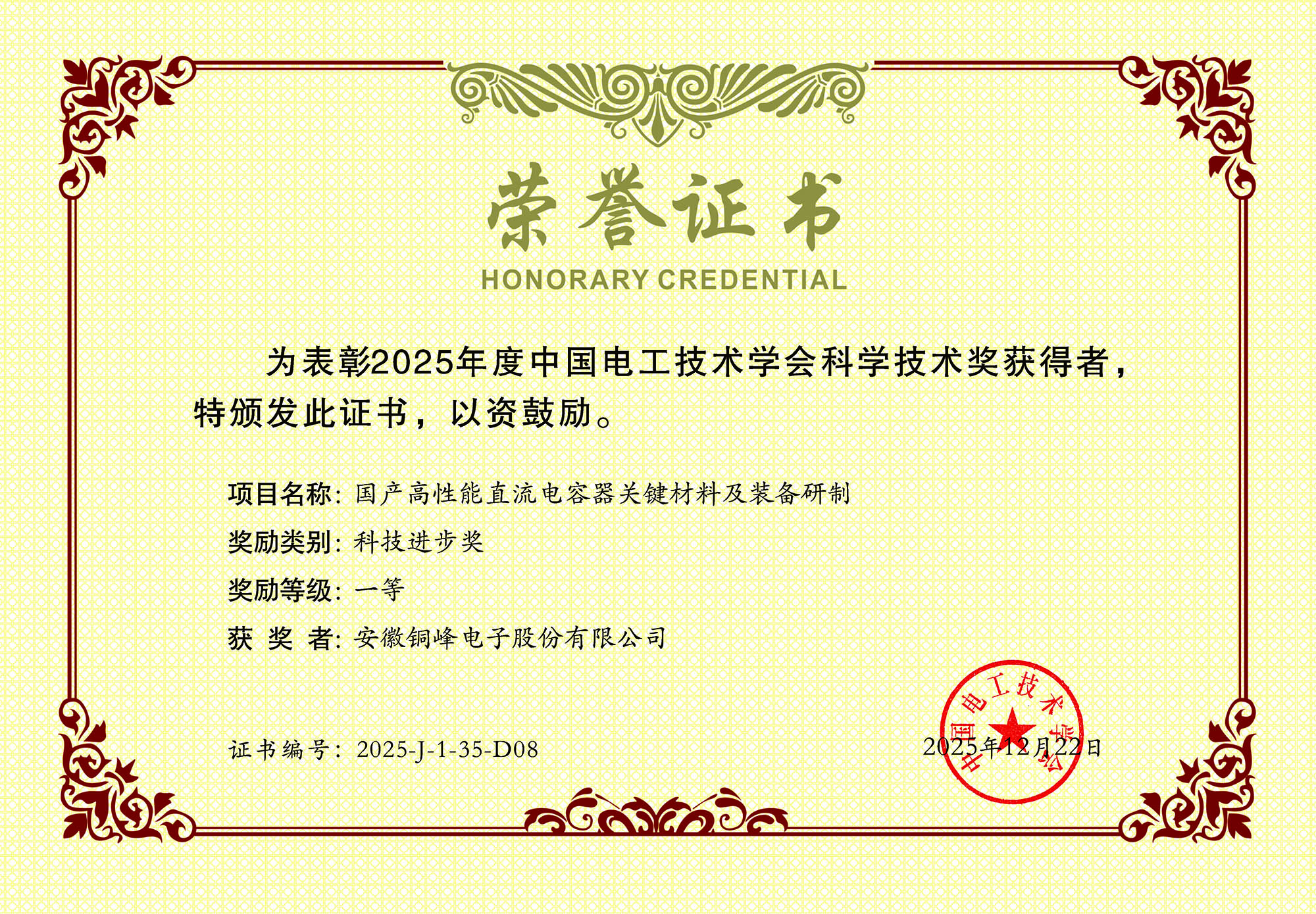 近日,公司參與的合作項目“國產(chǎn)高性能直流電容器關(guān)鍵材料及裝備研制”榮獲2025年度中國電工技術(shù)學(xué)會科技進步一等獎。
