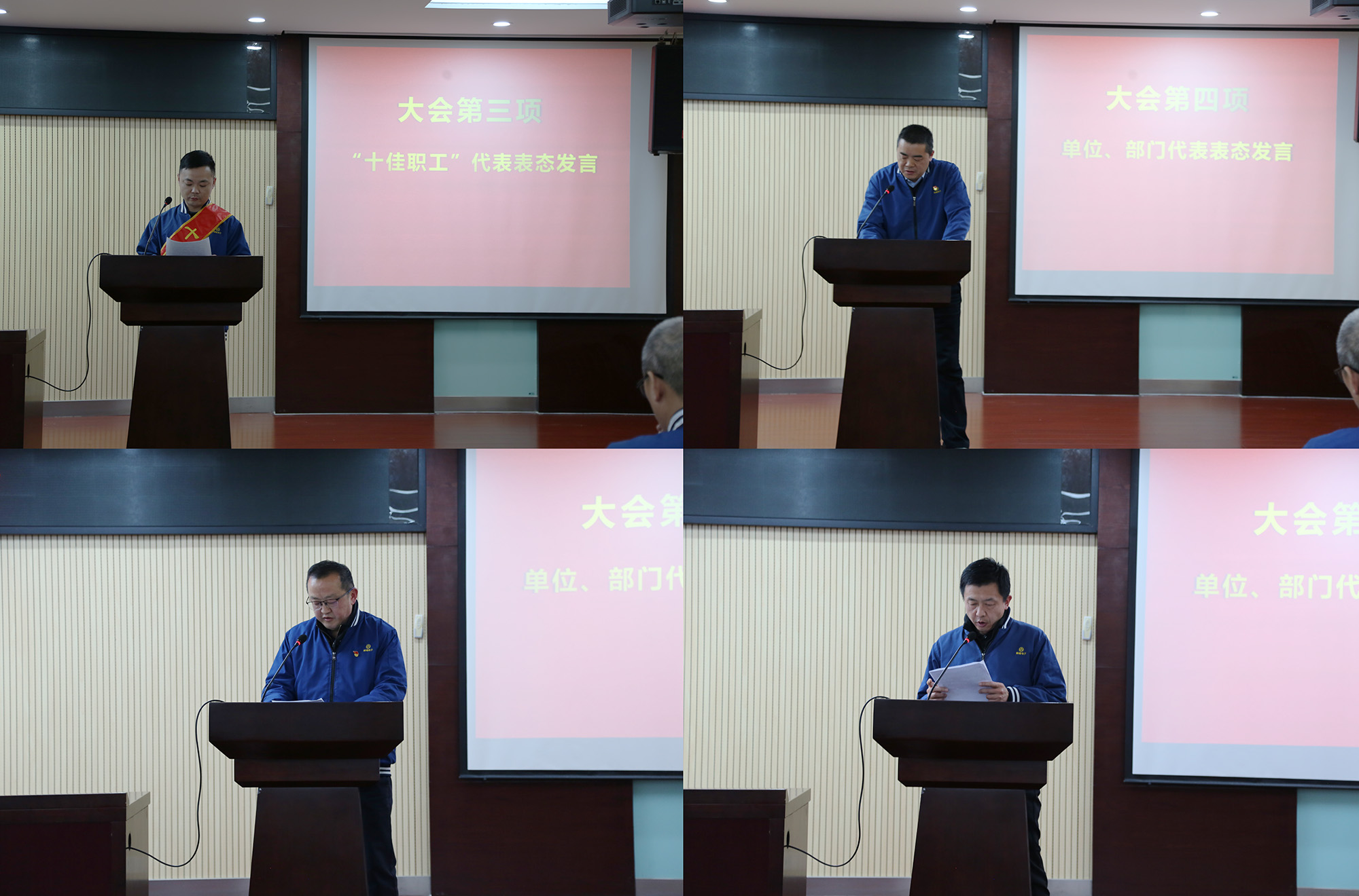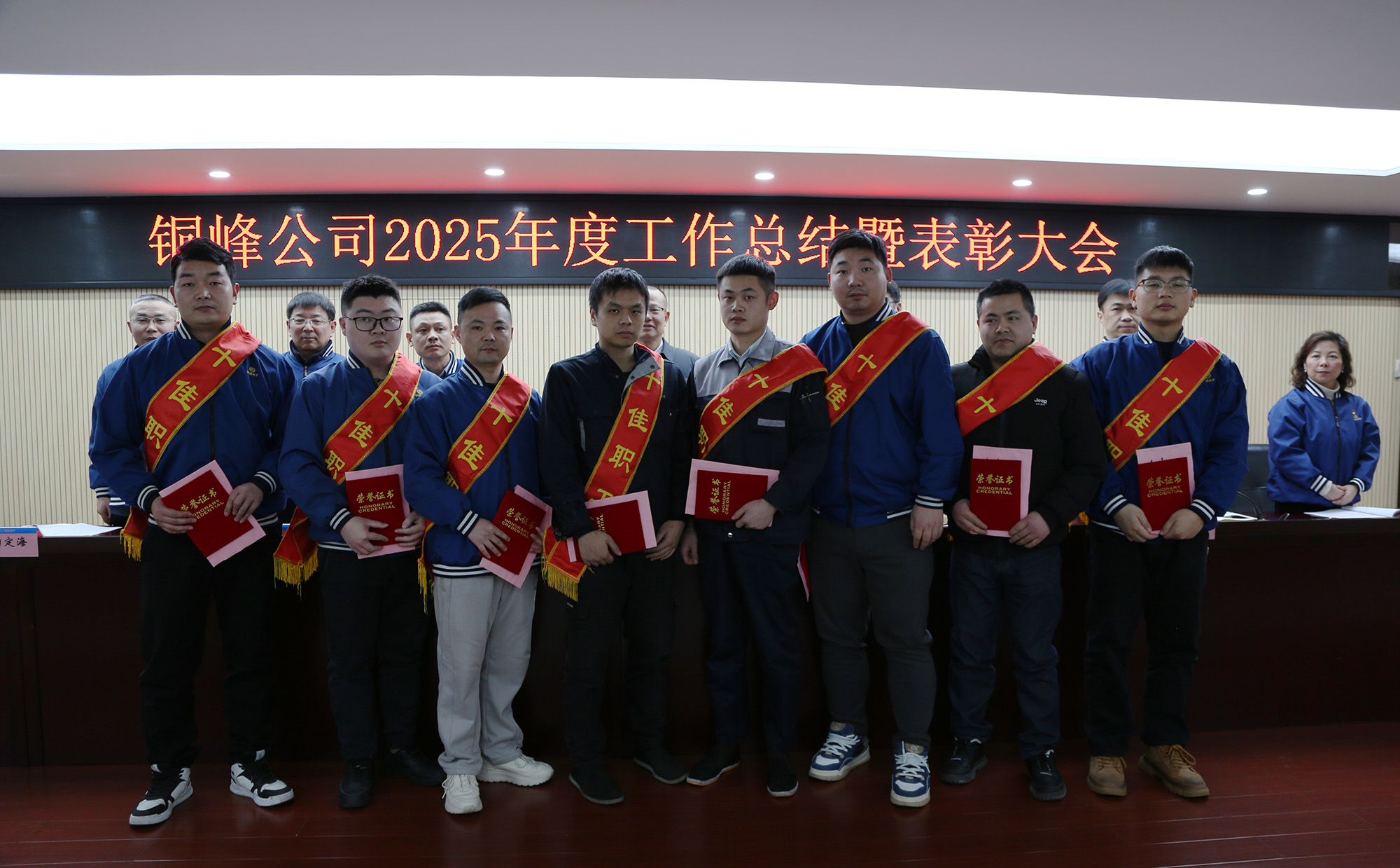 與會領(lǐng)導(dǎo)為受表彰的2025年度公司“十佳職工”頒發(fā)榮譽證書及獎金?!笆崖毠ぁ薄⒔?jīng)營單位和職能部門代表分別作表態(tài)發(fā)言。